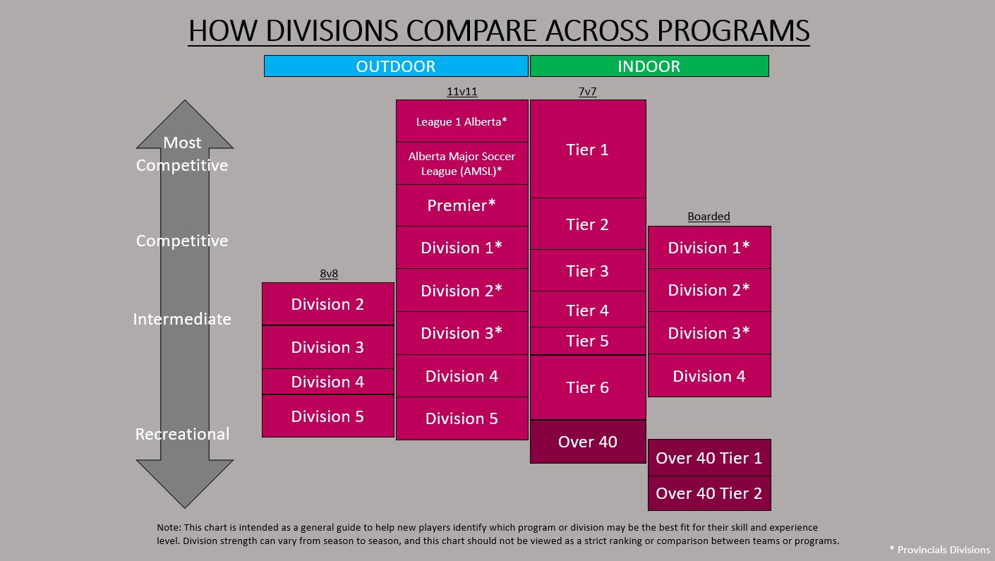 Note: The above chart is intended as a general guide to help new players identify which program or division may be the best fit for their skill and experience level. Division strength can vary from season to season, and this chart should not be viewed as a strict ranking or comparison between teams or programs.